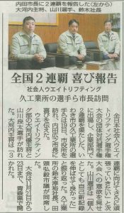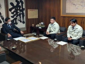 キャプテンの大河内優選手と大会で個人5位入賞を果たした山川良太選手の2名が、鈴木社長と共に、内田広之市長へ表敬訪問を行い、大会結果を報告しました。